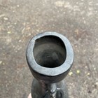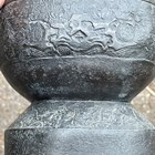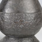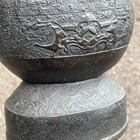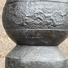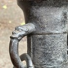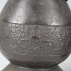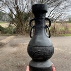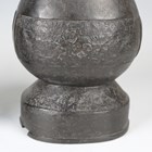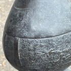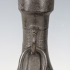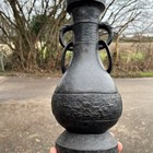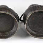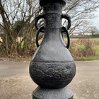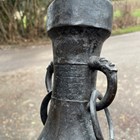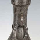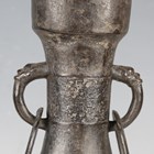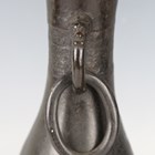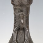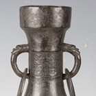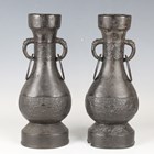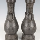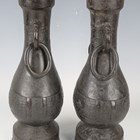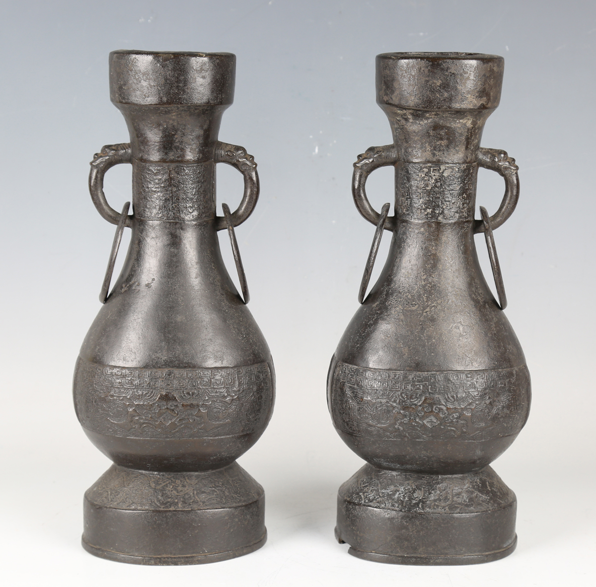 A pair of Chinese archaistic brown patinated bronze hu vases, Ming dynasty, each pear-form body cast with panels of taotie on a keyfret ground, the slender neck flanked by a pair of dragon mask and tongue loose ring handles, on oval bases, height 33.2cm (one with small missing section of footrim).