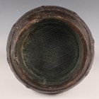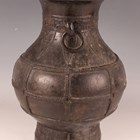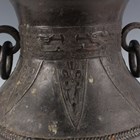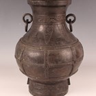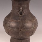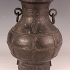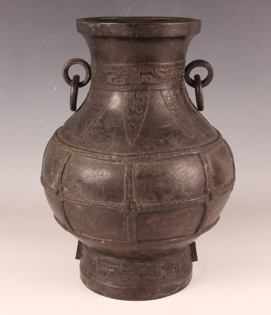 A Chinese dark brown patinated bronze vase, probably late Ming dynasty, the hu-shaped body with loose ring handles flanking a cast archaistic band and lappet panels above rope panelled borders, and an archaistic band to the circular foot, weight 3385g, height 29.5cm.