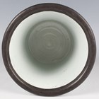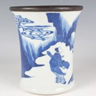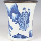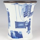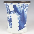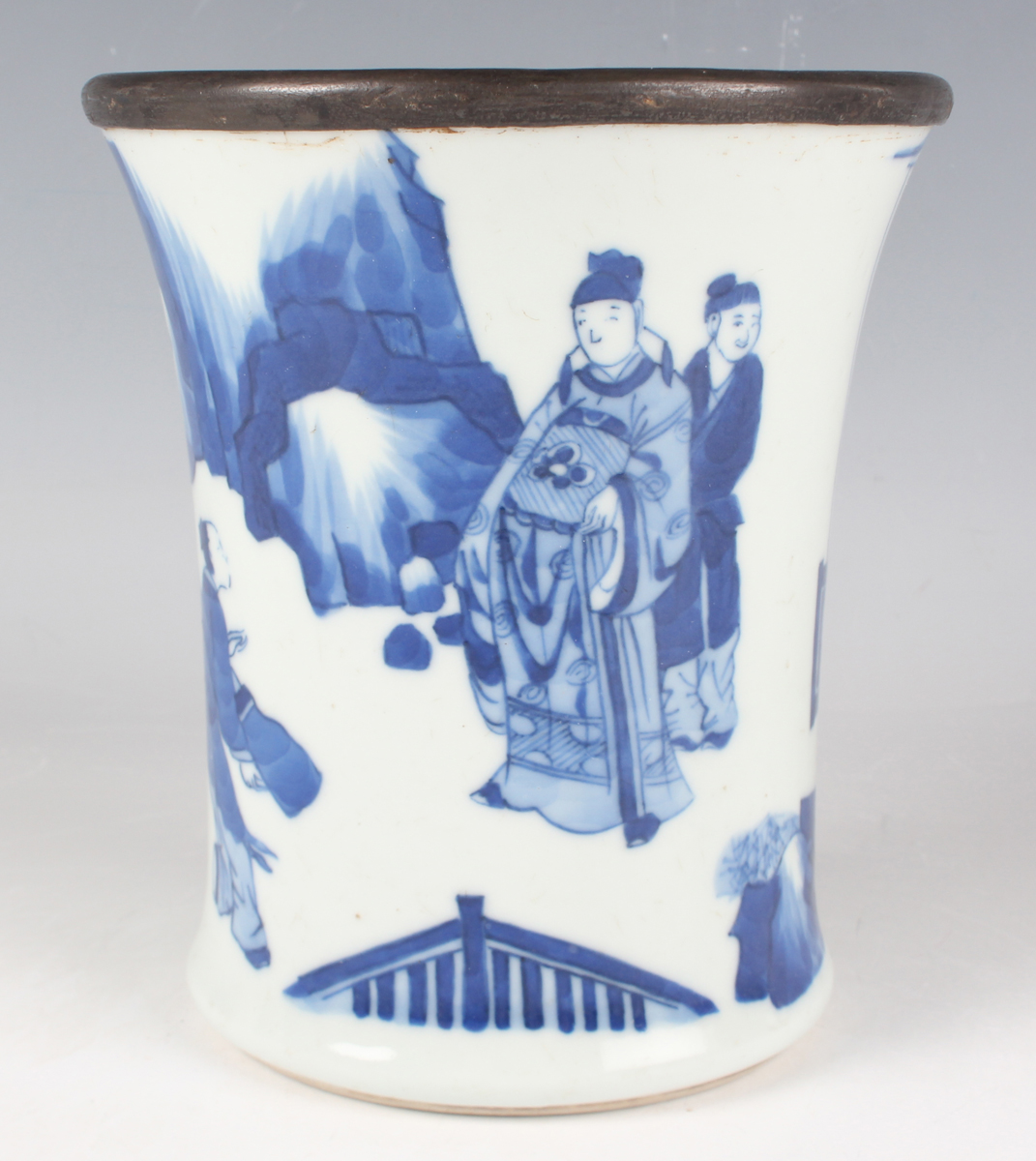 A Chinese blue and white porcelain brushpot, Kangxi style but later, of flared cylindrical form, painted with a figural scene beneath a metal mounted rim, height 14.6cm.