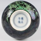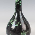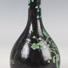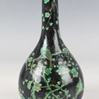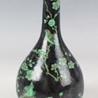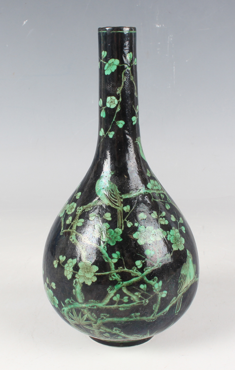 A Chinese green and black glazed porcelain bottle vase, Kangxi style but later, the ovoid body and narrow neck painted with two birds amidst blossoming prunus branches on a black glazed ground, underglaze blue four-character mark within double ring to base, height 16cm.
