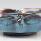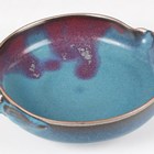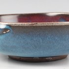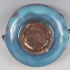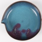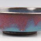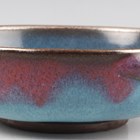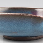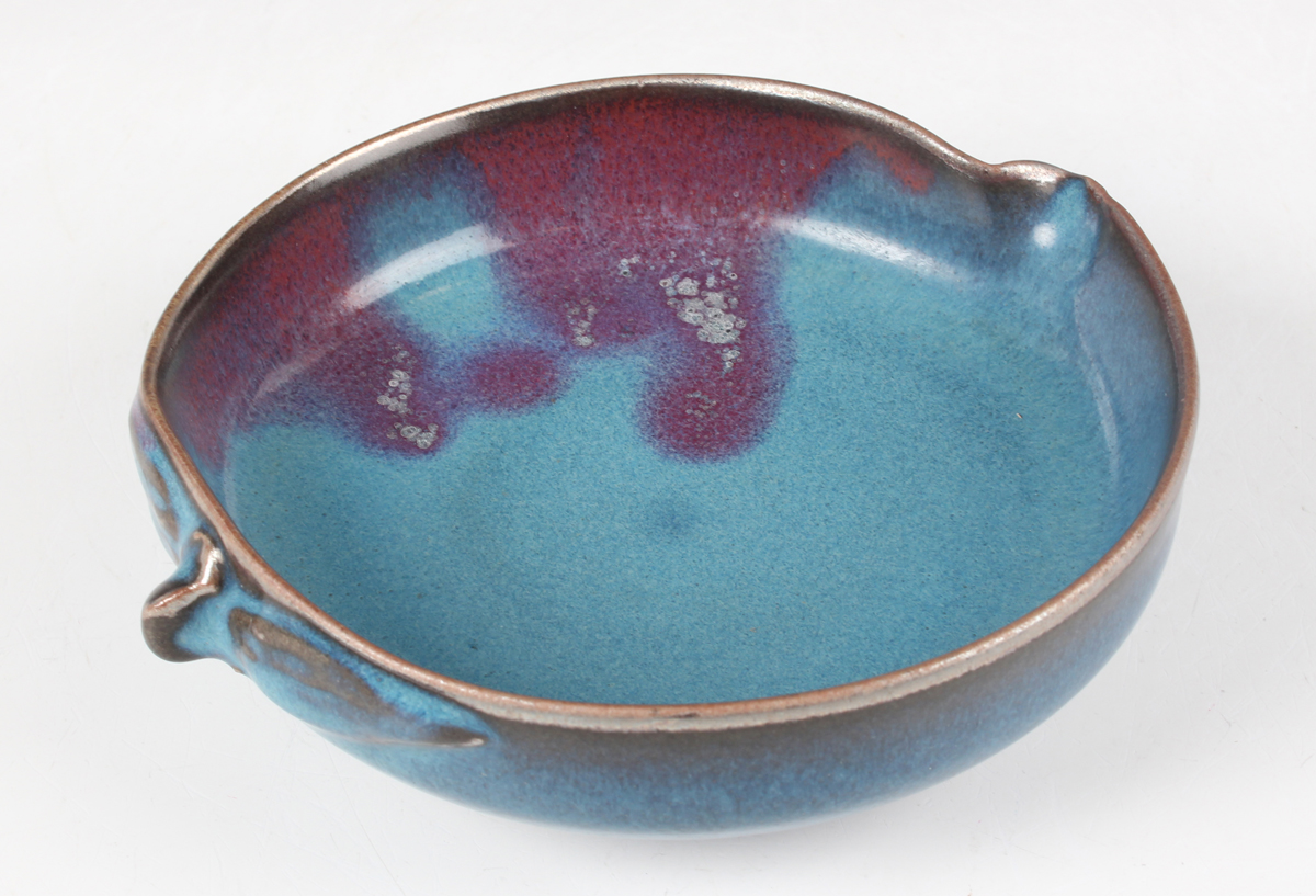 A Chinese Jun glazed brushwasher, Song dynasty style but later, of shallow peach form, covered in speckled blue glaze with purple splash to one side, length 15.3cm.