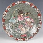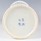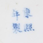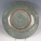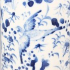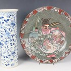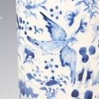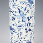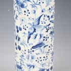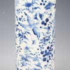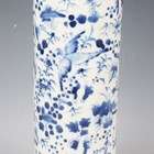 A Chinese blue and white porcelain cylinder vase, mark of Kangxi but late 19th century, painted with birds flying amidst flowers, underglaze blue four-character mark to base, height 29.8cm, together with a Japanese enamelled celadon crackle glazed circular dish, Meiji period, the centre decorated with a seated scholar within a scroll border, diameter 30.4cm.