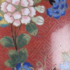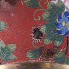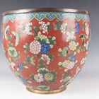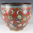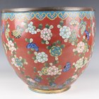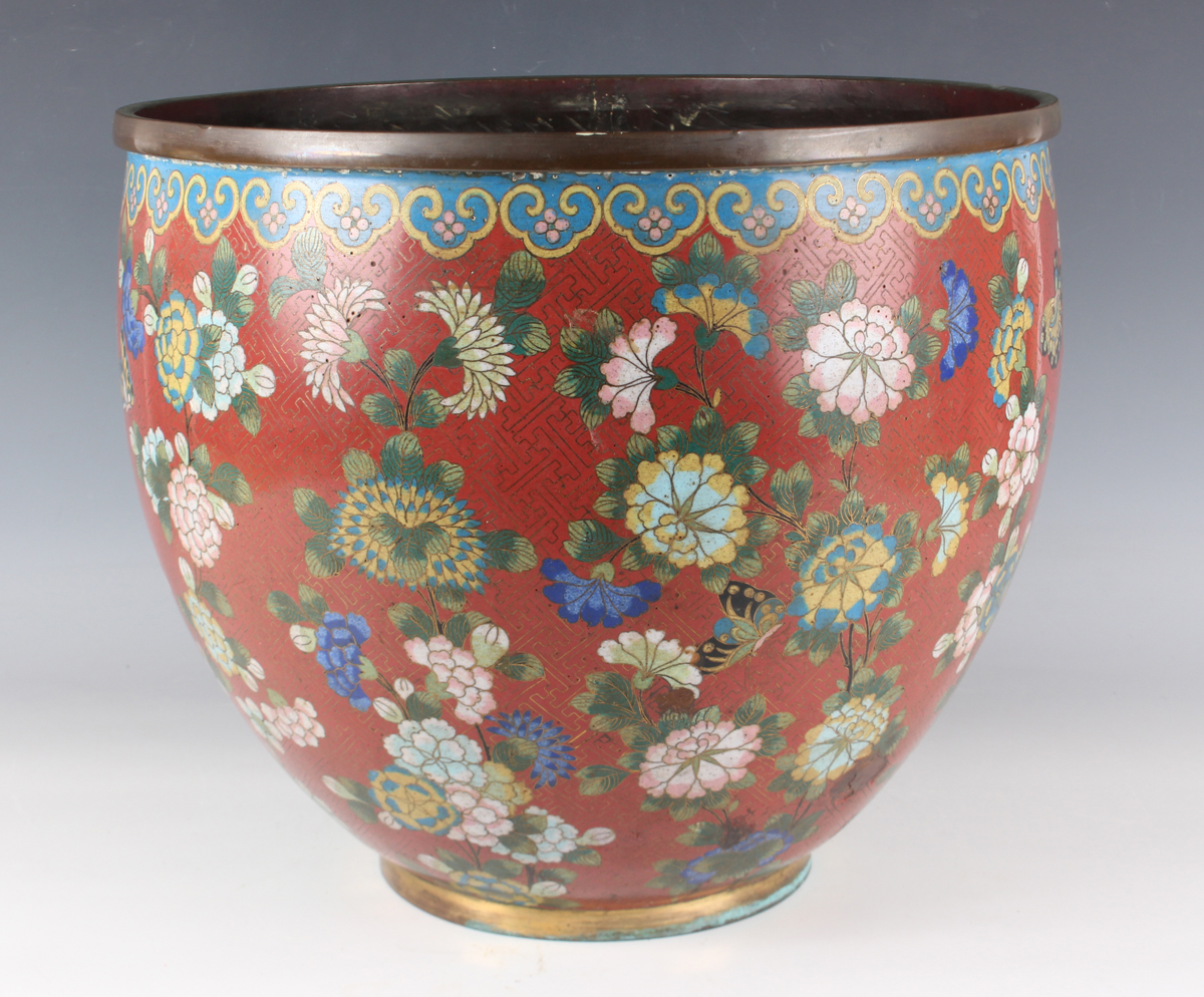A Chinese cloisonné jardinière, early 19th century, of 'U' shaped form, decorated with polychrome butterflies and flowers on a keyfret-filled iron red ground, height 30.8cm (minor faults).