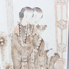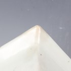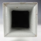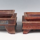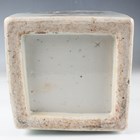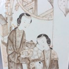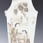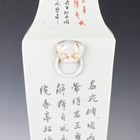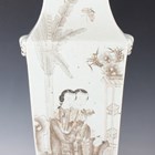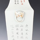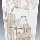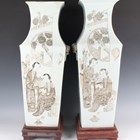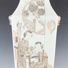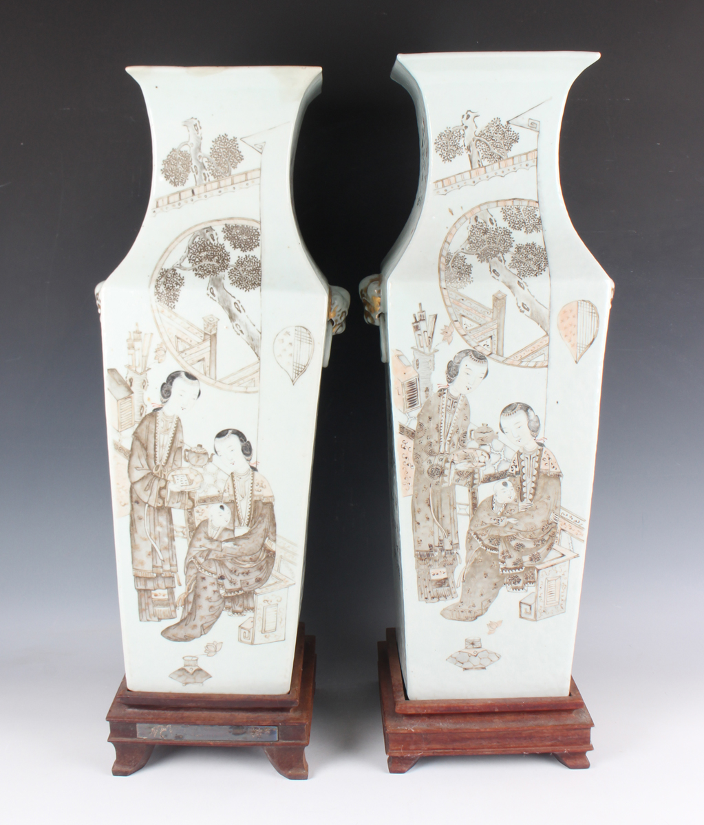 A pair of large Chinese Qianjiang cai porcelain vases, late Qing dynasty, each of square section baluster form with gilt moulded lion mask and ring handles, each painted with opposing scenes of two maidens and a child, the other sides with lines of predominantly black and red text and red seal mark, height 57.8cm (one with minor rim restoration), with later wood stands.