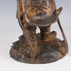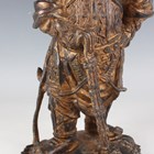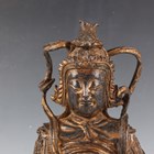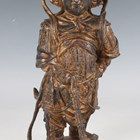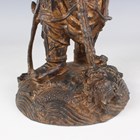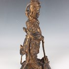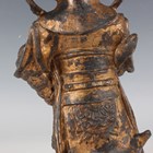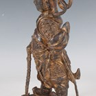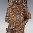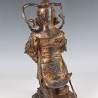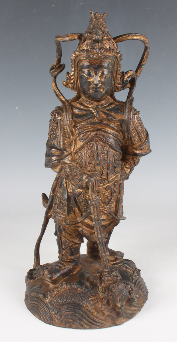 A Chinese bronze figure of Guandi, Ming style but probably late Qing dynasty, with traces of gilt detail, the god of war modelled standing wearing armour and holding a sword, on a dragon and wave moulded circular base, height 31cm.