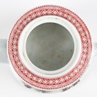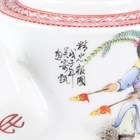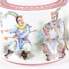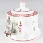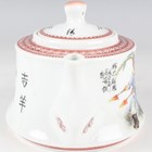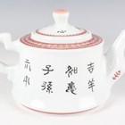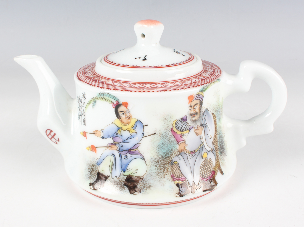 A Chinese famille rose porcelain teapot, Republic period style but probably later, the circular body painted with a scene of two figures beside black text, opposing eight black characters, within iron red borders, the cover with four black characters, iron red seal mark to base, height 8.7cm.