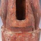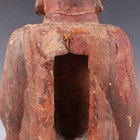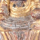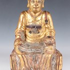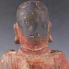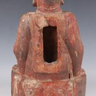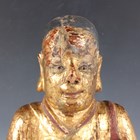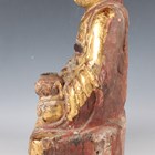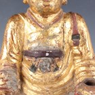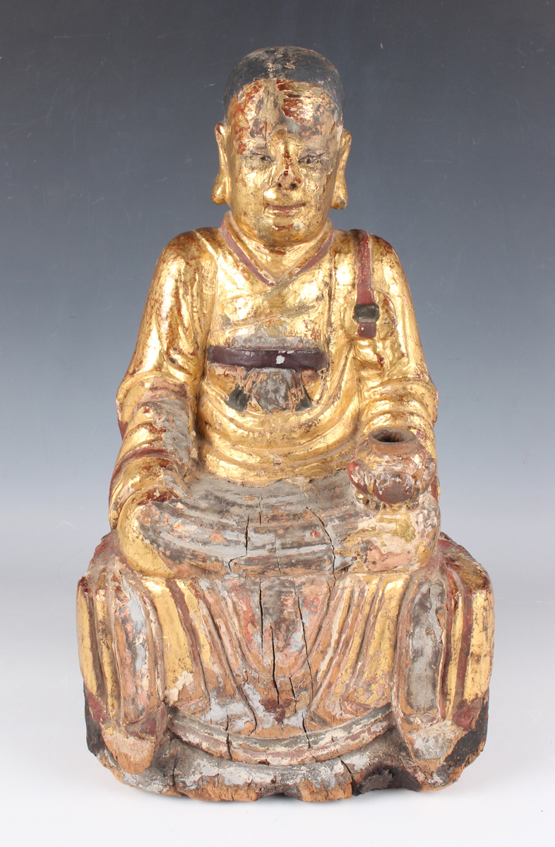 A Chinese gilt-lacquered wood figure of a deity or attendant, Qing dynasty, modelled seated on a throne, wearing a long robe and holding a pot in his left hand, height 40cm.