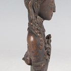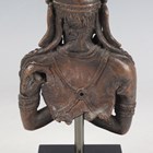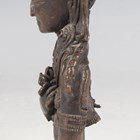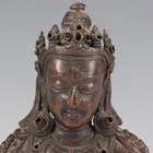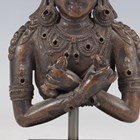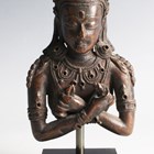 A Tibetan bronze fragment figure of Vajradhara, possibly 16th century, modelled wearing an ornate headdress and jewellery, with arms crossed holding a vajra and ghanta, height 11.5cm, mounted on a black rectangular plinth.