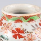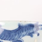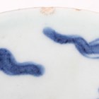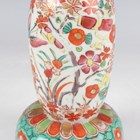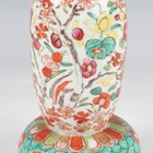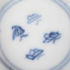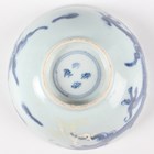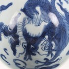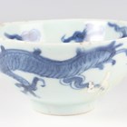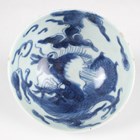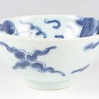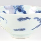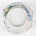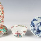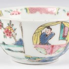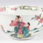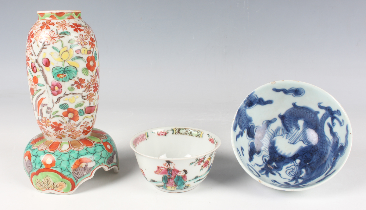 A Chinese famille rose export porcelain teabowl, Yongzheng period, the exterior painted with two figures out-of-doors being watched by a further figure looking from a window, height 3.6cm, diameter 7.4cm, together with a Chinese blue and white porcelain 'dragon' bowl, Kangxi period, painted with a dragon, four-character mark to base, height 4.7cm, diameter 9.7cm (minor chips), and a Chinese famille rose enamelled porcelain vase, height 13.5cm (minor rim restoration).