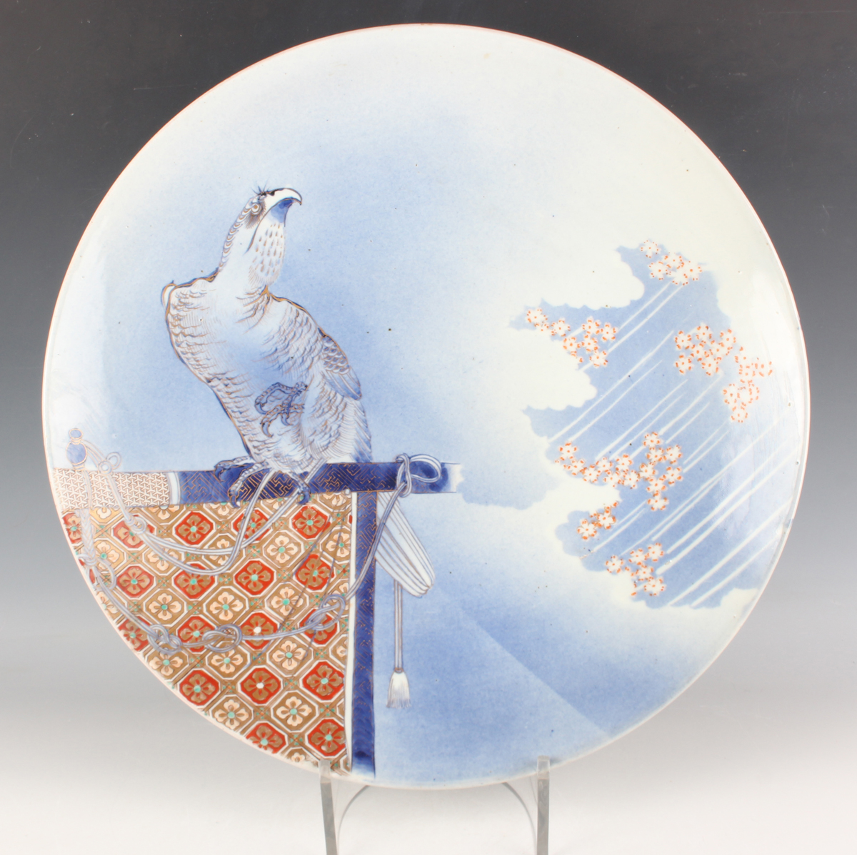 A Japanese Imari porcelain circular charger dish, Meiji period, painted with an eagle tethered to its roost, diameter 45cm.