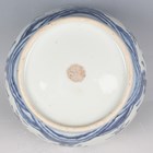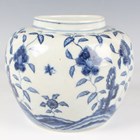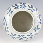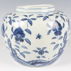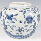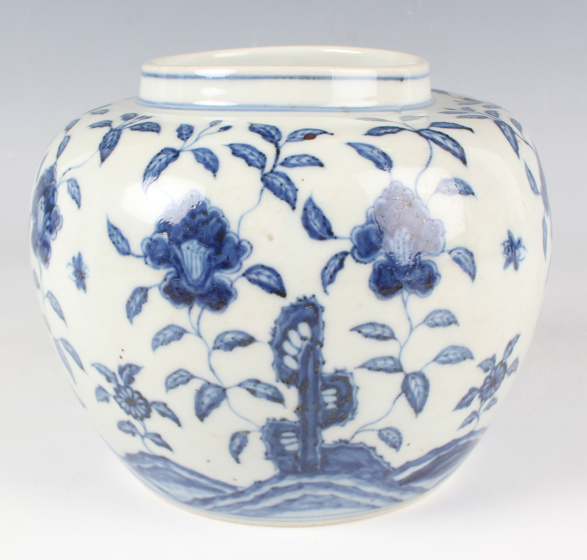 A Chinese blue and white porcelain jar, Ming style but 20th century, of stout ovoid form, painted with flowers and leafy stems emanating from rocks, height 10.7cm.