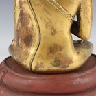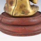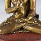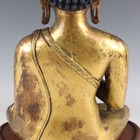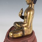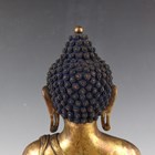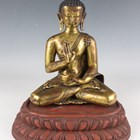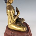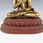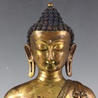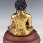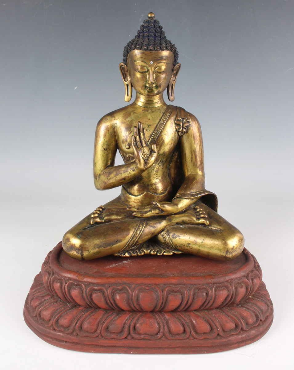 A Tibetan gilt bronze figure of Amitabha Buddha, probably 20th century, modelled seated in dhyanasana with hands held in bhumisparsa mudra, his hair tightly curled and rising to a domed usnisa, height 3095g, height 22cm, on a painted and carved wood double lotus stand.