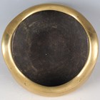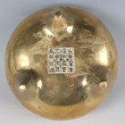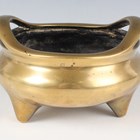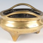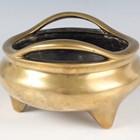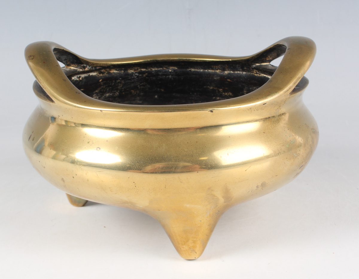 A Chinese polished bronze bombé censer, mark of Xuande but Qing dynasty, the low-bellied circular body with a pair of loop handles, on three short feet, cast sixteen-character mark 'Da Ming Xuan De Wu Nian Jian Du Gong Bu Guan Cheng Wu Bong Zuo Zao' (made by Wu Bangzuo in the fifth year of Xuande period) to base, weight 893g, height 8.2cm, width across handles 13cm, rim diameter 12.5cm.