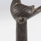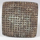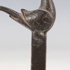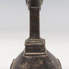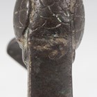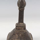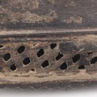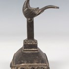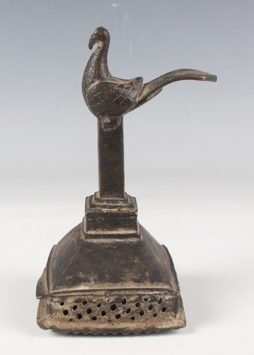 An Indian brass scrubbing implement, late 19th century, the rectangular base with pierced sides and crosshatched underside, the handle with peacock finial, height 12.5cm.