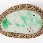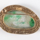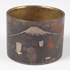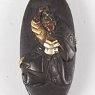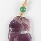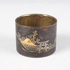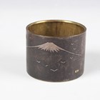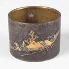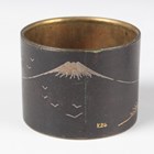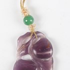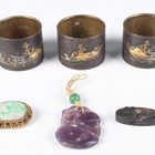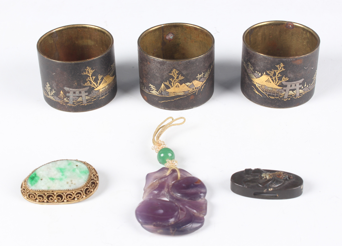 A Chinese amethyst quartz pendant, 20th century, carved and pierced in the form of two peaches and leaves, length 4.5cm, together with a Chinese silver gilt and jade brooch, length 3.6cm, a Japanese bronzed copper kashira, Meiji period, finely cast in relief with a figure, picked out in silver and gilt, length 3.4cm, and three Japanese Komai style napkin rings, damascened with scenes of the floating torii gate and Mount Fuji, diameter 4.1cm.