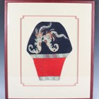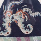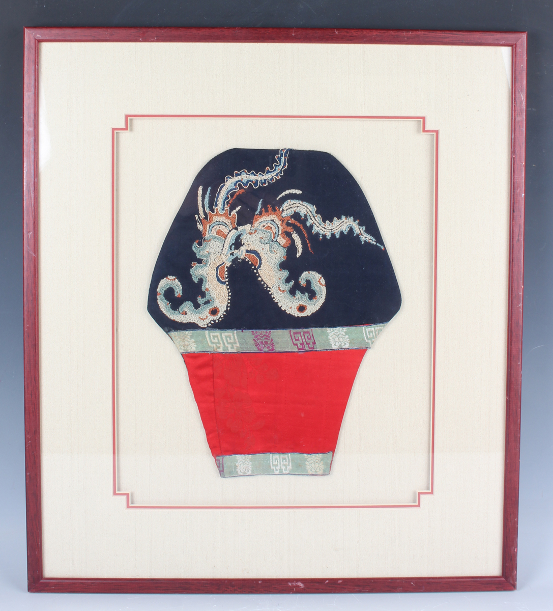 A Chinese silk embroidered shoulder panel, early 20th century, worked in coloured threads on a blue ground, length 28.5cm, mounted, framed and glazed.