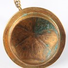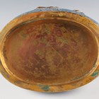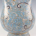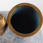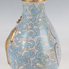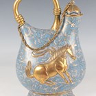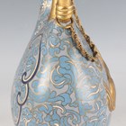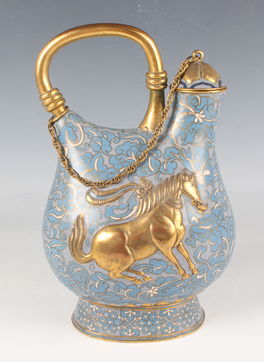 A Chinese gilt copper mounted cloisonné enamel flask and domed cover, early 20th century, imitating a Tang dynasty silver original, the blue floral decorated body applied with a gilt horse drinking from a cup, beneath a gilt overhead handle, height 23cm.