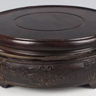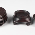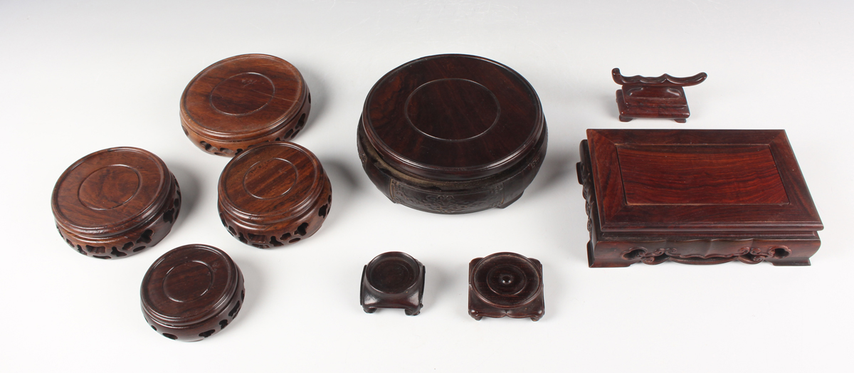 A small collection of Chinese hardwood stands, early 20th century and later, including a rectangular stand with carved and pierced frieze, length 15cm, five circular stands, diameters ranging from 6.7cm to 14cm, and three smaller stands.