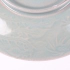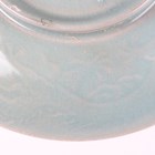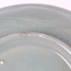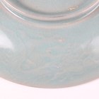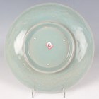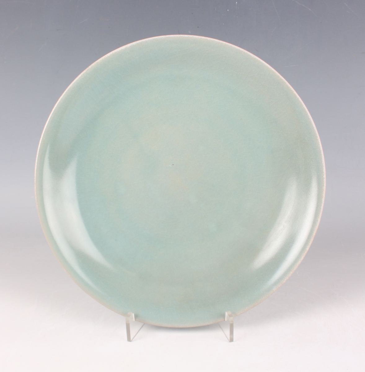 A Chinese celadon glazed circular dish, Song dynasty style but probably 20th century, of shallow form, the underside of the rim decorated in low relief with a dragon and fenghuang, diameter 19.5cm.