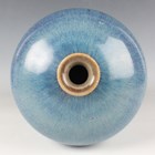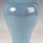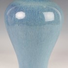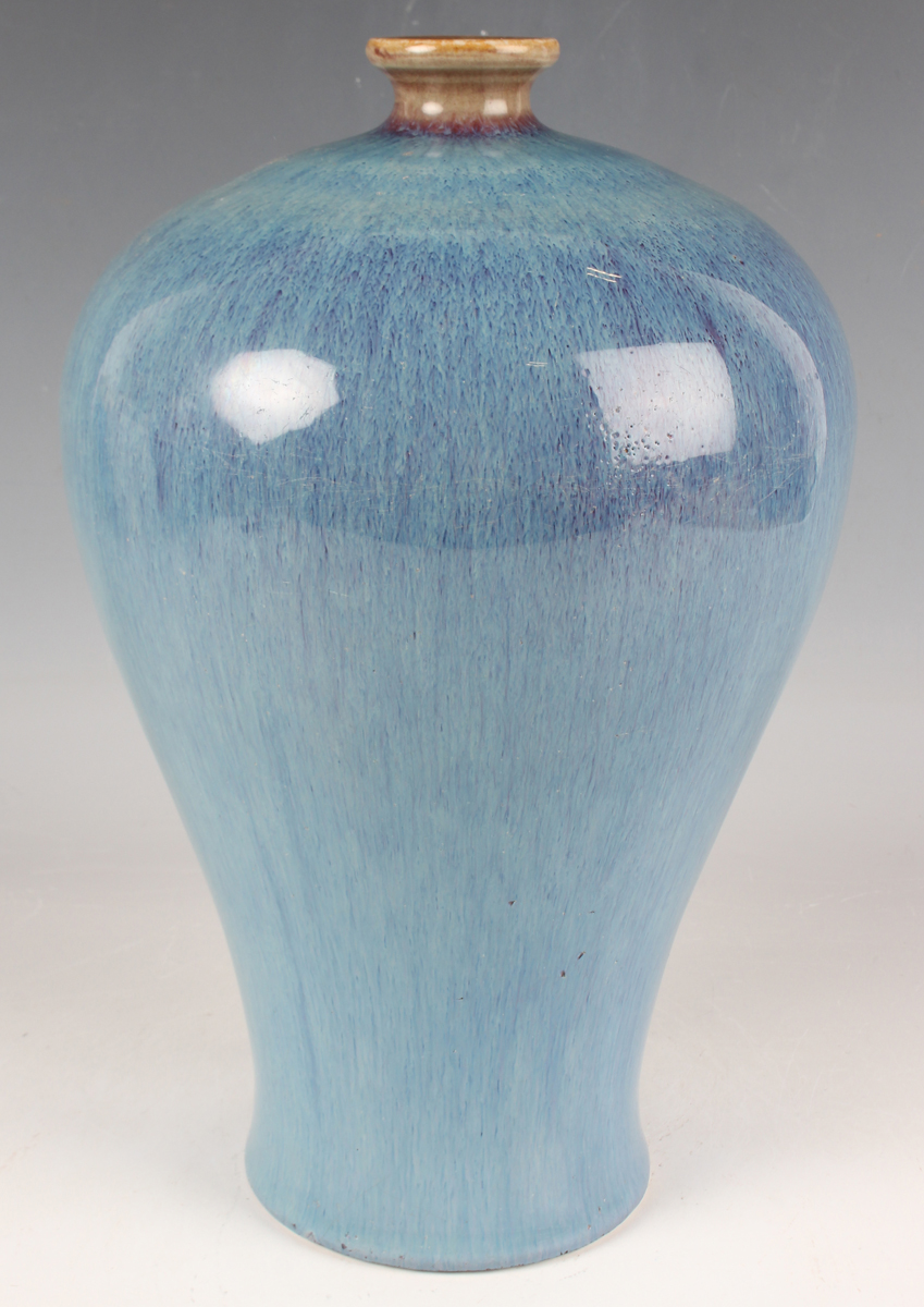 A Chinese Jun glazed porcelain meiping, mark of Qianlong but probably late Qing dynasty, the baluster body covered in a streaky pale blue and purple glaze, impressed seal mark to base, height 28.5cm (firing crack to footrim).