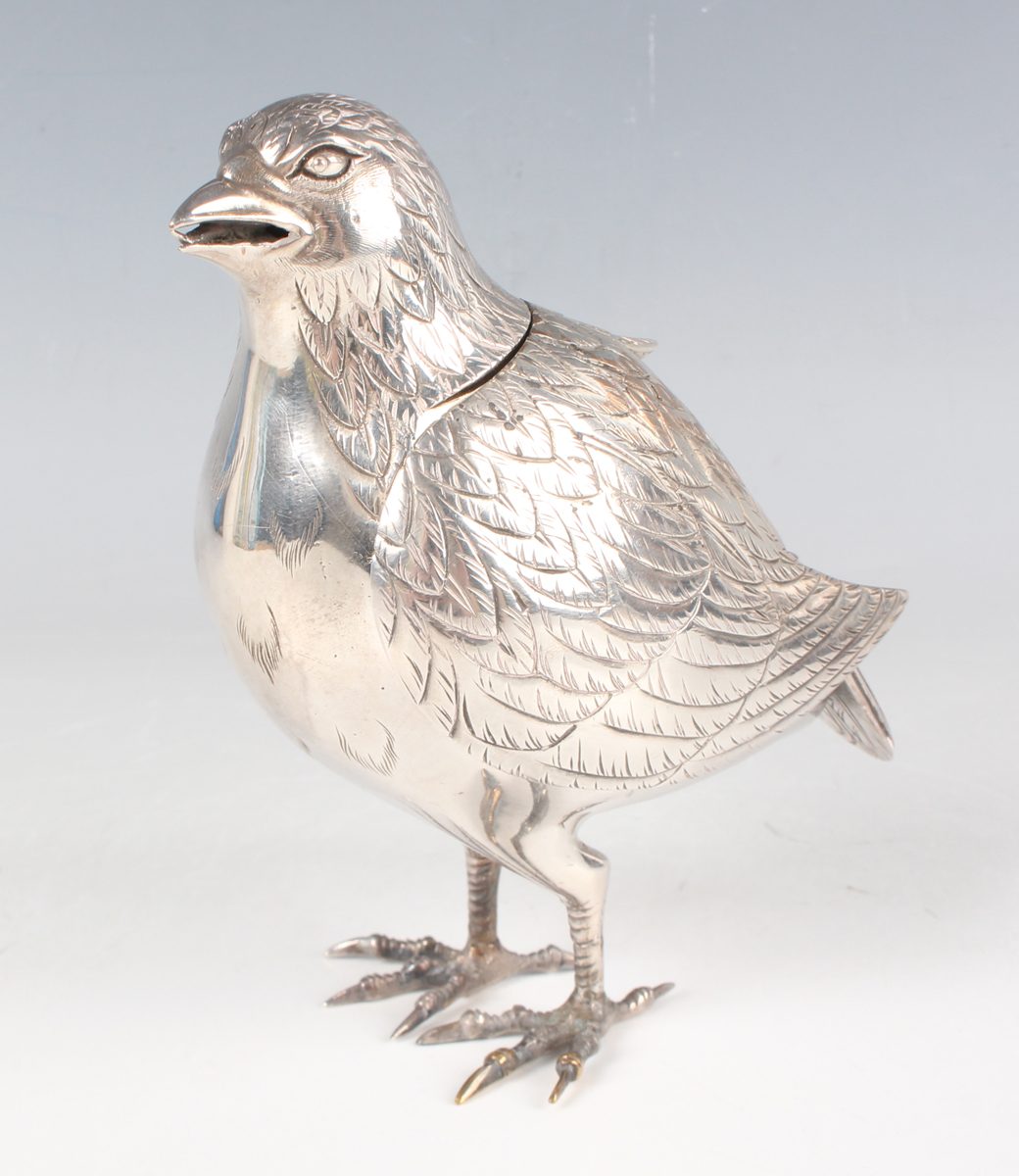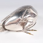 An Indian plated box and cover, probably late 19th/early 20th century, of bird form with finely engraved plumage, the wings forming the detachable cover, height 12.9cm.