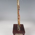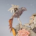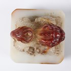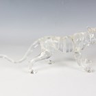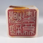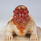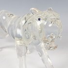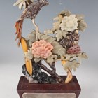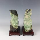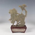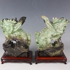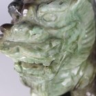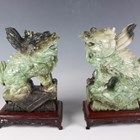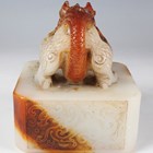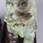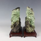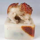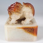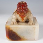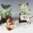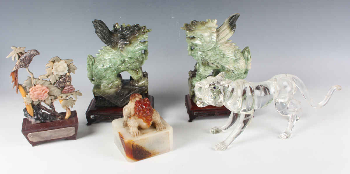 A Chinese soapstone seal with carved Buddhistic lion surmount, the cube base carved in low relief with dragon panels, incised two-character mark to top, height 9.3cm, together with a pair of green hardstone Buddhistic lions, height 17.5cm, with wood stands, a soapstone flower arrangement and a glass tiger, length 33cm.