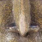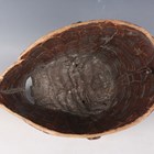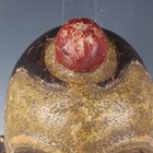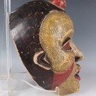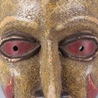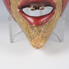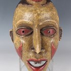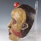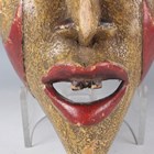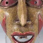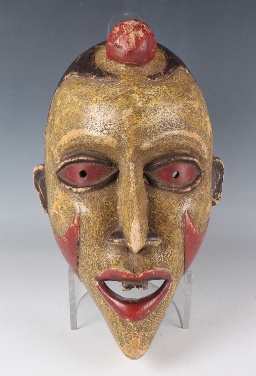 A South-east Asian painted wood mask, possibly Javanese or Sinhalese, early 20th century, carved with top knot, pierced eyes and open mouth, decorated with iron red, ochre and brown painted detail, length 32cm.