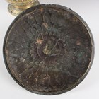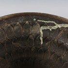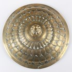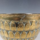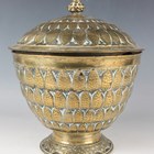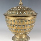 A Malayan brass lotus form bowl and cover, 19th century, probably Brunei, the domed cover and body cast with lotus petals beneath a knop finial, the outswept foot cast with scrolling foliate decoration, height 26.5cm (some faults).
