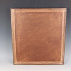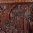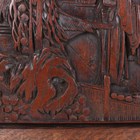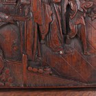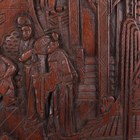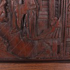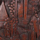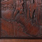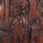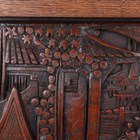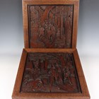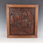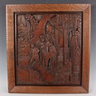 A pair of Chinese Canton carved elm rectangular panels, 20th century, each carved in relief with three figures on a terrace, 35cm x 32cm, later oak framed.