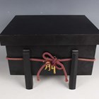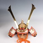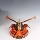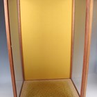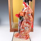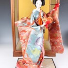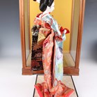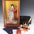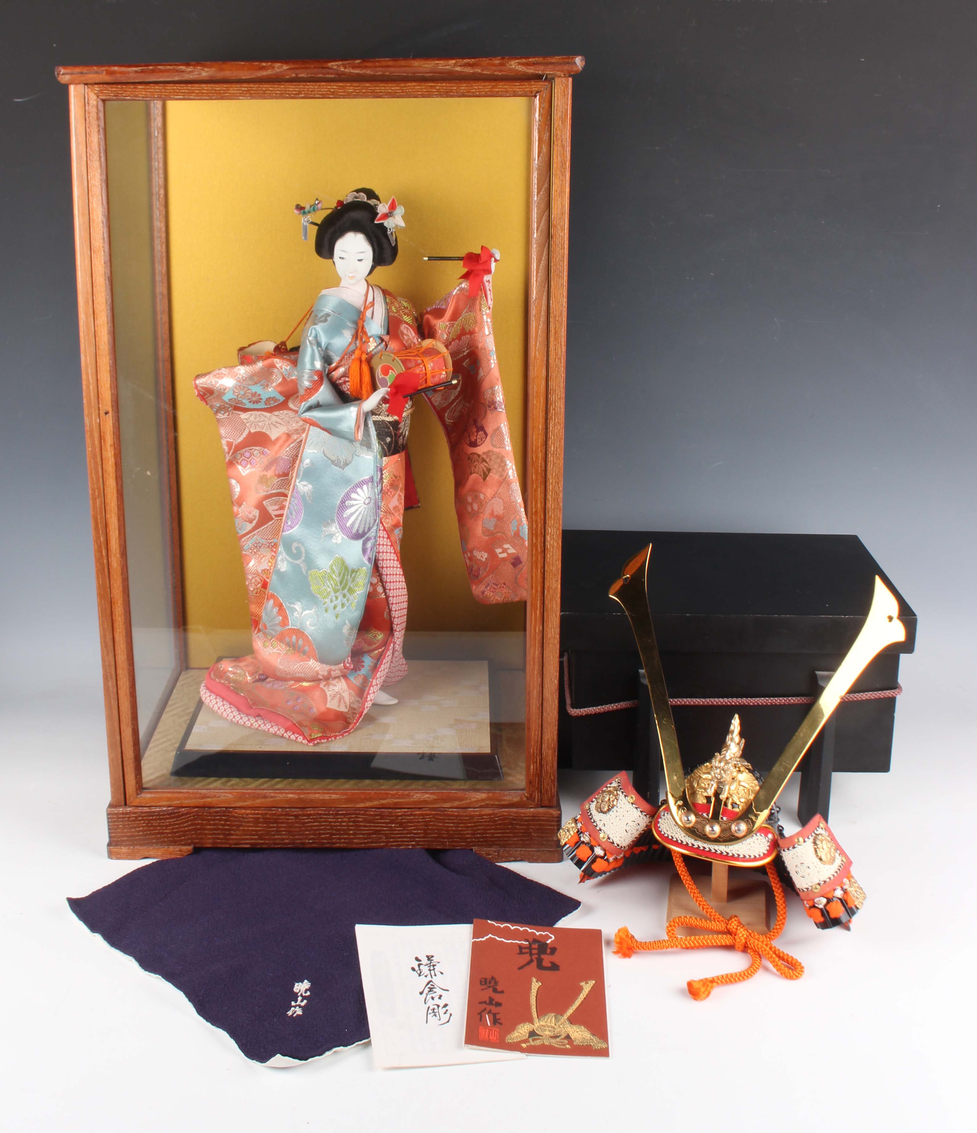 A Japanese model of a geisha, mid to late 20th century, modelled standing wearing a silk kimono, within a glazed softwood framed display case, height 55cm, together with a Japanese display model of a samurai helmet, within a black lacquer box.