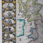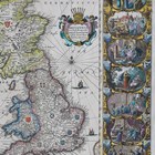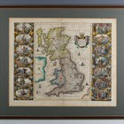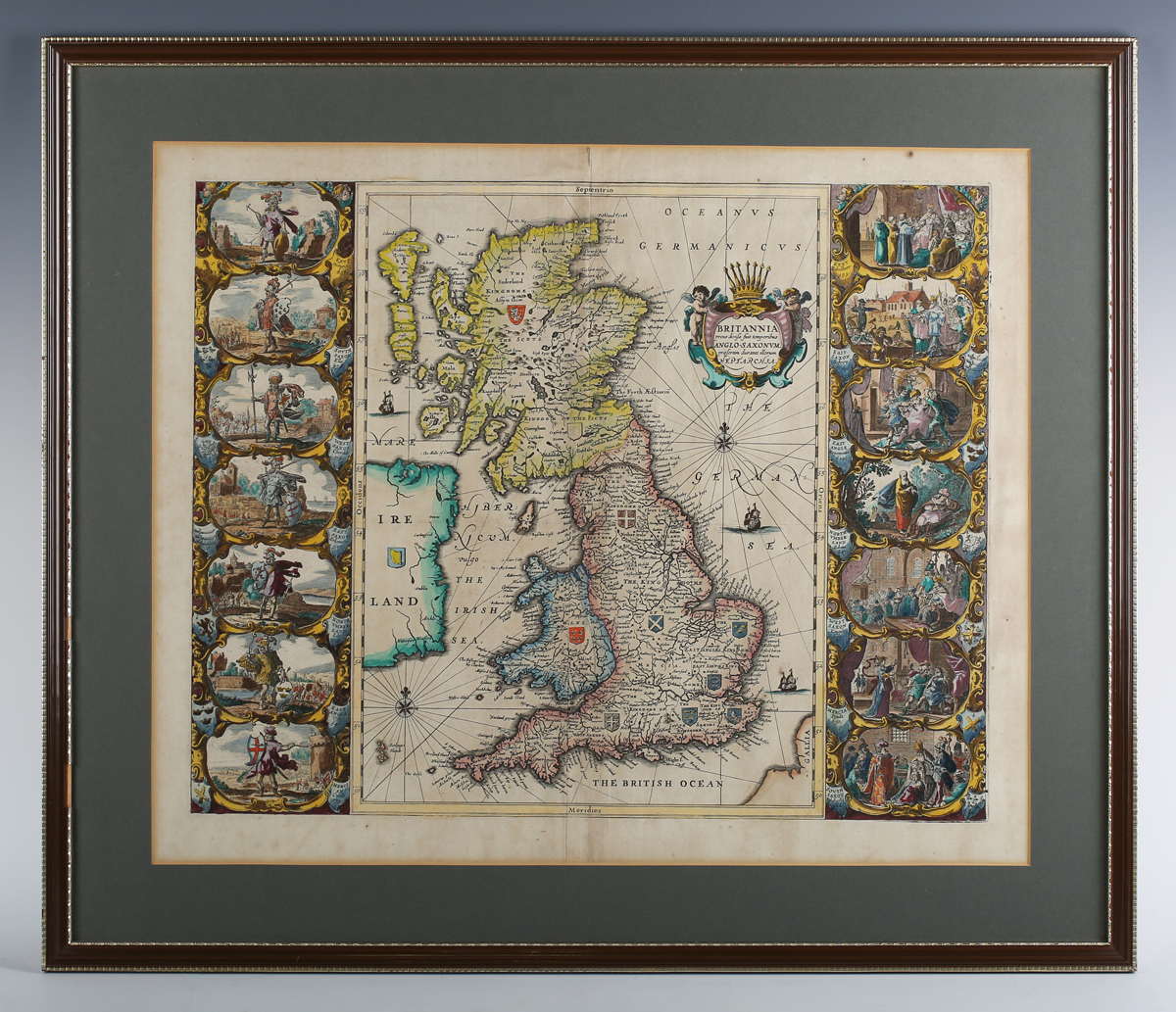 Johannes Blaeu - 'Britannia prout divisa suit temporibus Anglo-Saxonum, praesertim durante illorum Heptarchia': map of the British Isles decorated with side borders featuring fourteen engraved vignettes representing episodes of Anglo-Saxon history, engraving with hand-colouring, 42cm x 52.5cm, within a brown Hogarth style frame.
