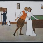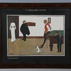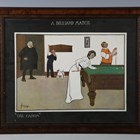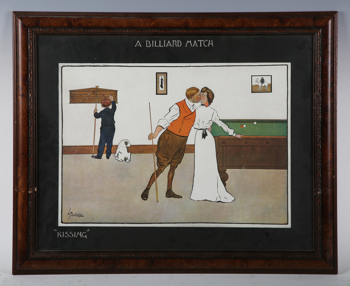 "After L Thackeray - 'A Billiard Match: ""Snookered""; ""Left""; ""The Canon""; ""Kissing""’, a set of four chromolithographs, published 1902 by Landeker & Brown London England, each 40cm x 51cm, within walnut-veneered frames (4)."