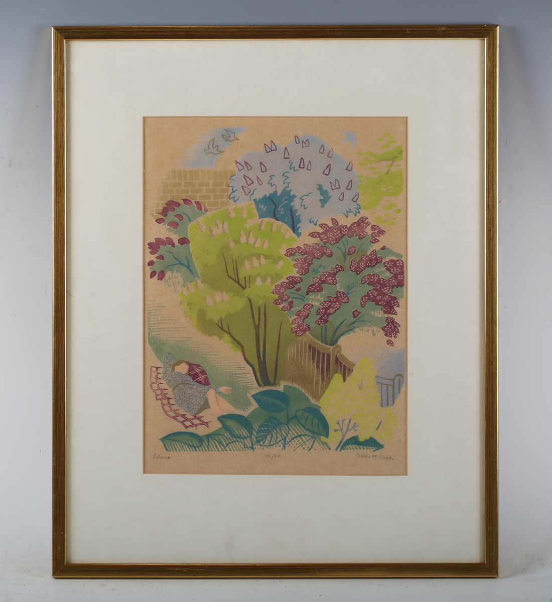 Alice Margaret Coates (British 1905-1978) - ‘Lilacs’, colour linocut, signed lower right, numbered 10/50 lower centre, titled lower left, 33cm x 24cm, within a gilt frame.