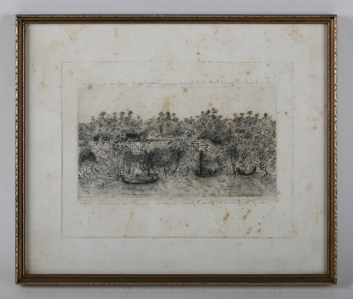 Anthony Gross (British 1905-1984) - ‘Souvenir de Voyage, Naaf River Arakan’, etching, signed, inscribed and numbered 32/50, 11.5cm x 20cm, together with three framed George Cruickshank engravings and a watercolour landscape by Anthony Colbert, ‘Arundel Flatlands’ (3). Provenance: from the estate of the late Raymond Briggs, the world-renowned author and illustrator of The Snowman, Father Christmas and Fungus The Bogeyman.
