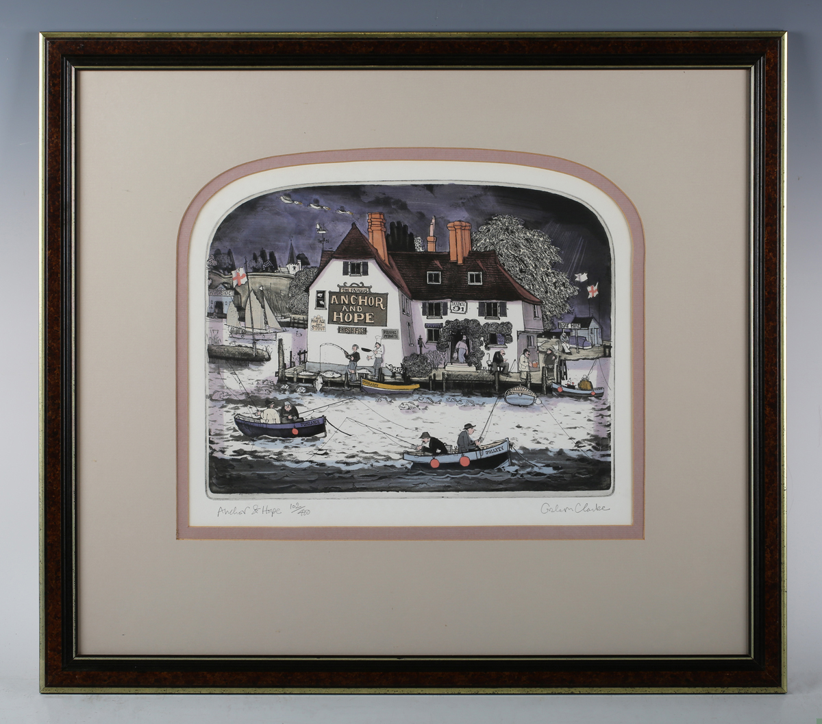 Graham Clarke (British b.1941) - ‘Anchor & Hope’, coloured etching with aquatint, signed lower right, titled and numbered 102/400 lower left, p.26.5cm x 33.5cm, within a gilt and faux walnut frame.