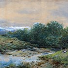 Charles N. Woolnoth (1815-1906) - Wooded river landscape with cattle and figures, watercolour and bodycolour, signed lower right, 45cm x 69cm, within a gilt frame.