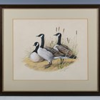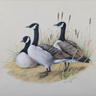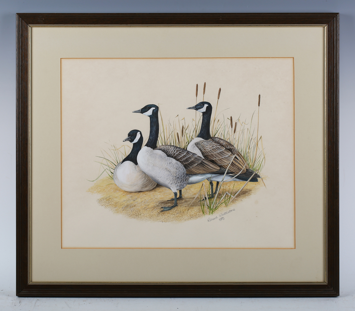 Richard Whittlestone (British b.1963) - Canada Geese; Kestrel, two, watercolour, both signed lower right and dated 1985 and January 1986 respectively, the first 35cm x 42.5cm, the second 39cm x 32cm, both within stained wood frames (2).