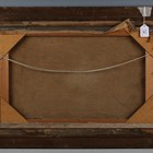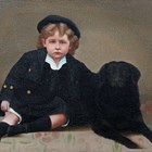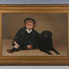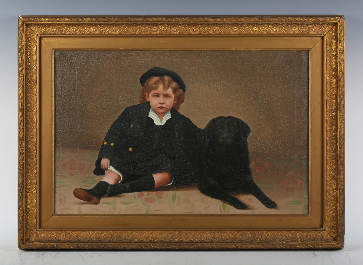 English School (late 19th century) - Portrait of a seated boy with his pet dog, oil on canvas, probably over a printed base, 38.5cm x 59cm, within a gilt composition frame.