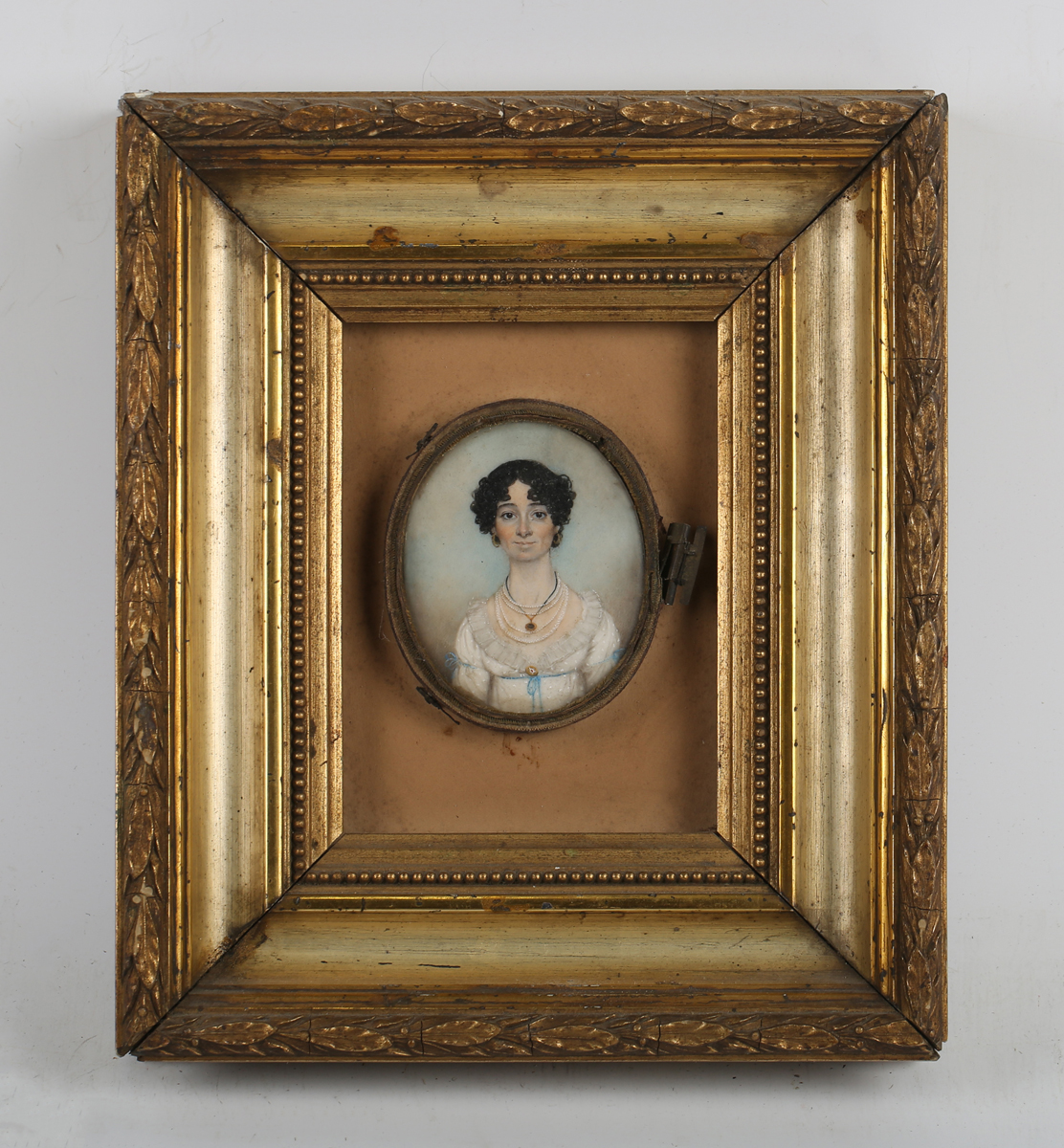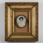 English School (19th century) - Portrait miniature of a lady, watercolour on ivory, oval, 7.5cm x 6cm, within a gilt composition frame. Provenance: from the estate of the late Raymond Briggs, the world-renowned author and illustrator of The Snowman, Father Christmas and Fungus The Bogeyman. Note: a non-transferrable ivory exemption certificate has been granted for the sale of this item.