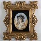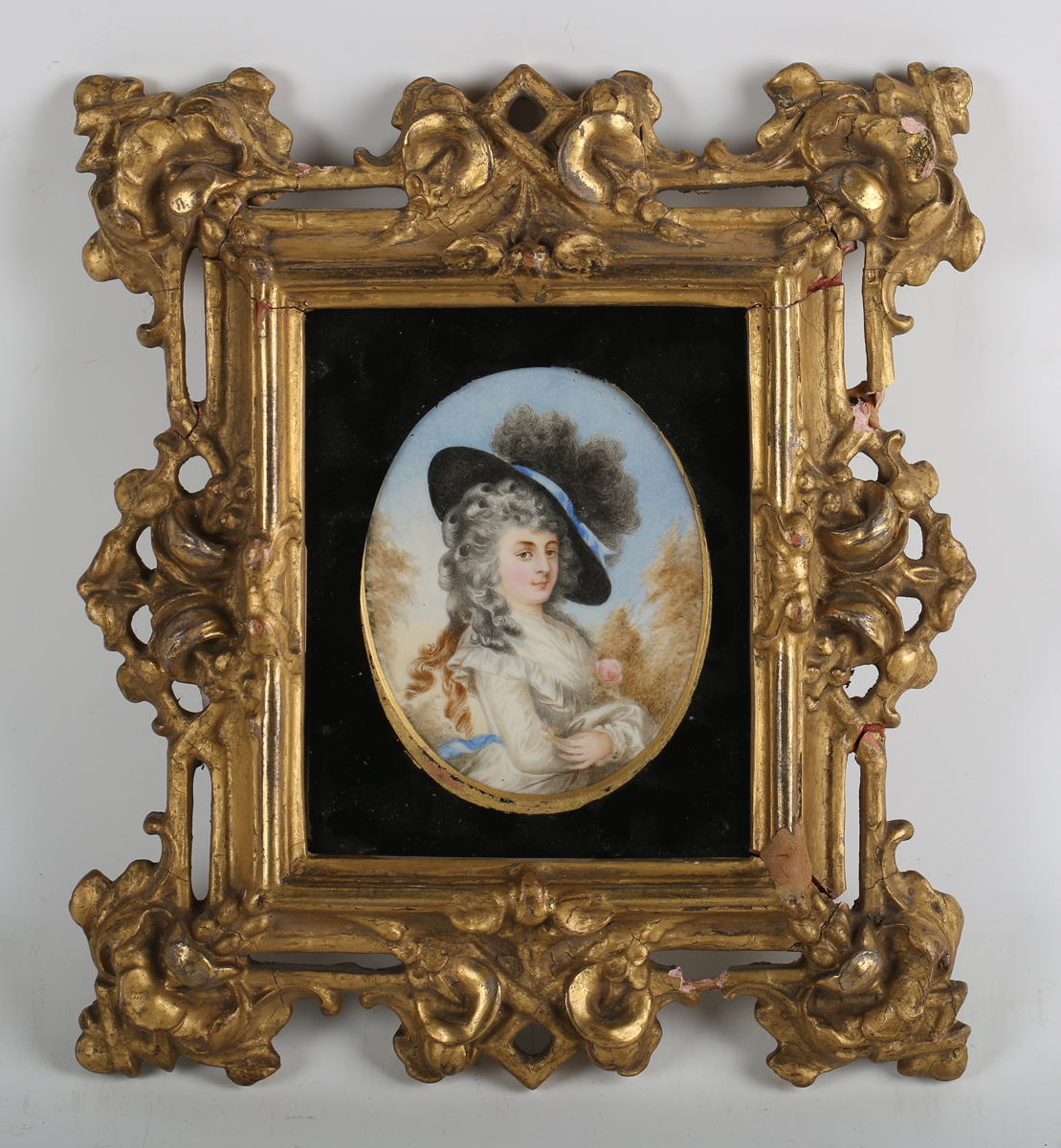 After Sir Thomas Gainsborough (British 1727-1788) - Portrait miniature of Lady Georgiana Spencer, Duchess of Devonshire, 19th century watercolour on ivory, oval, 11cm x 8.5cm, within a carved and pierced giltwood frame. Note: a non-transferrable ivory exemption certificate has been granted for the sale of this item.