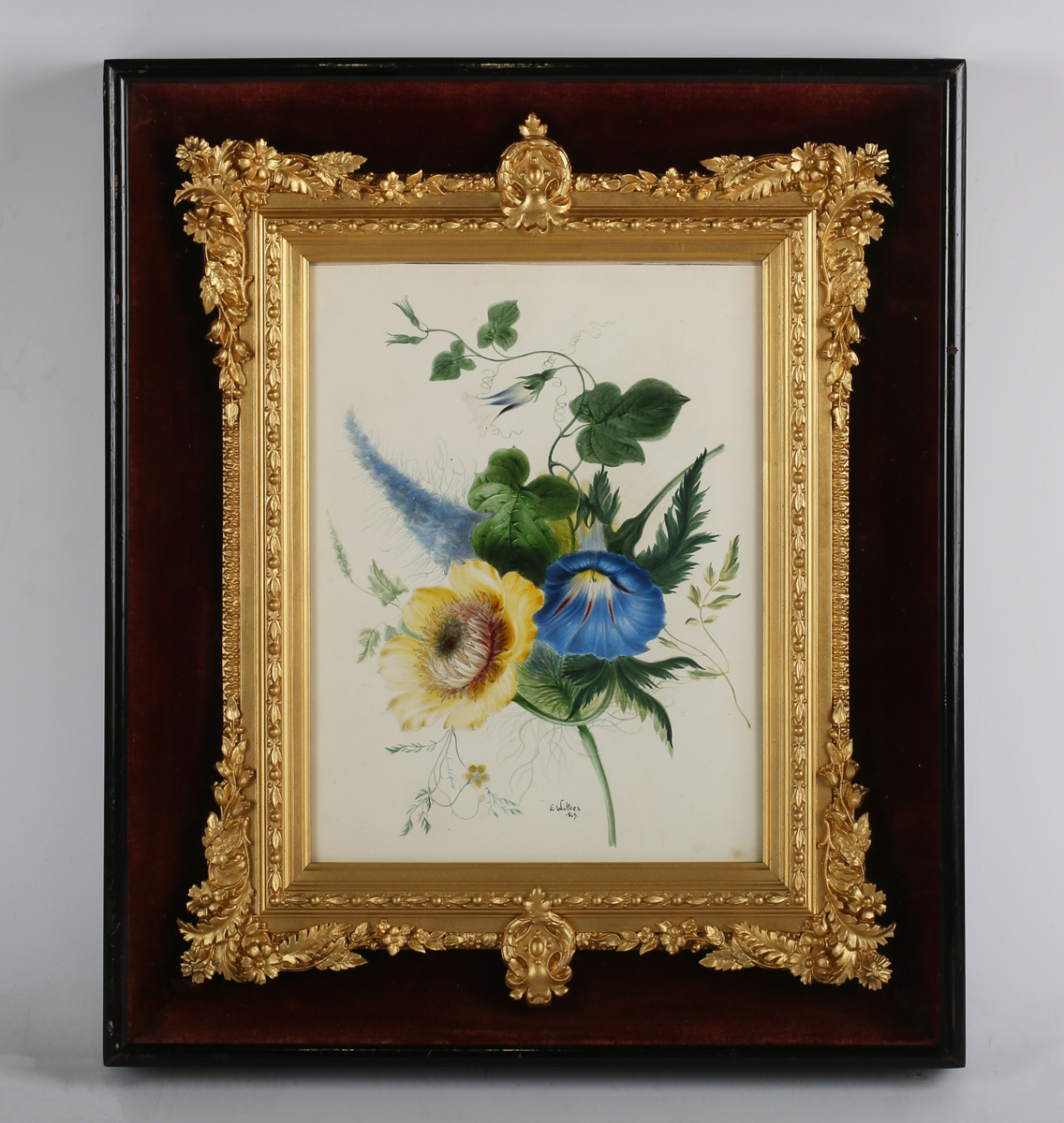 English School (19th century) - Floral still life with convolvulus, watercolour, bears signature and date lower centre, 20cm x 15cm, within a gilt composition frame and glazed wood case.