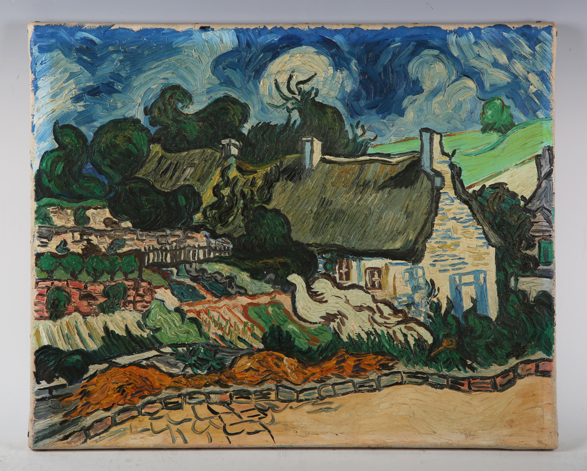 After Vincent van Gogh (Dutch 1853-1890) - ‘Thatched Cottages at Cordeville, 1890’, oil on canvas, inscribed and dated 1965 on stretcher and overlap, 45.5cm x 55.5cm, unframed.