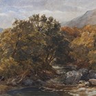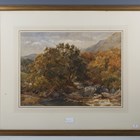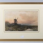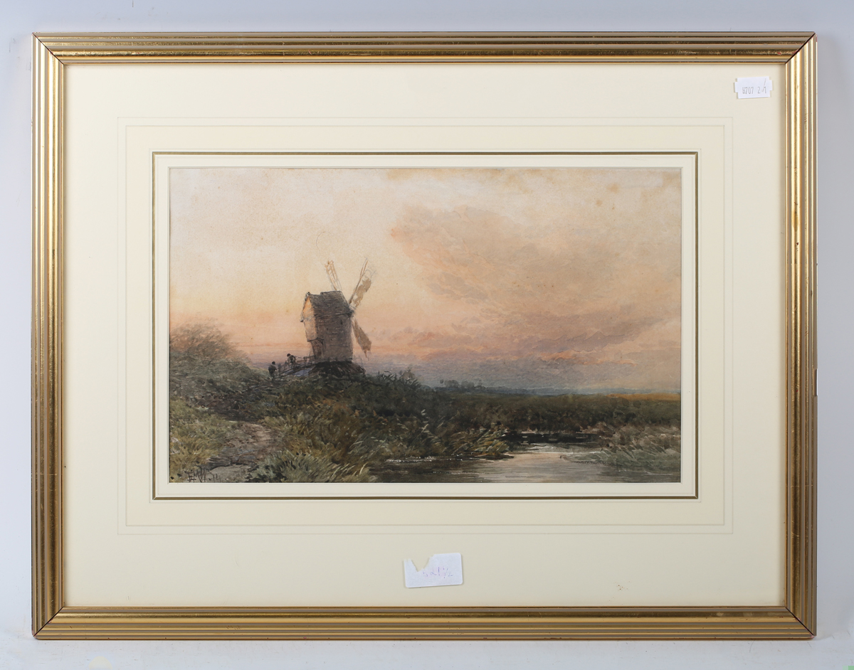 Edmund Morrison Wimperis (British 1835-1900) - Windmill at sunset, watercolour, signed with initials and dated ’74 lower left, 21cm x 34cm, together with another watercolour of a rocky river scene, signed with initials lower left, 34cm x 46cm, both within gilt frames (2).
