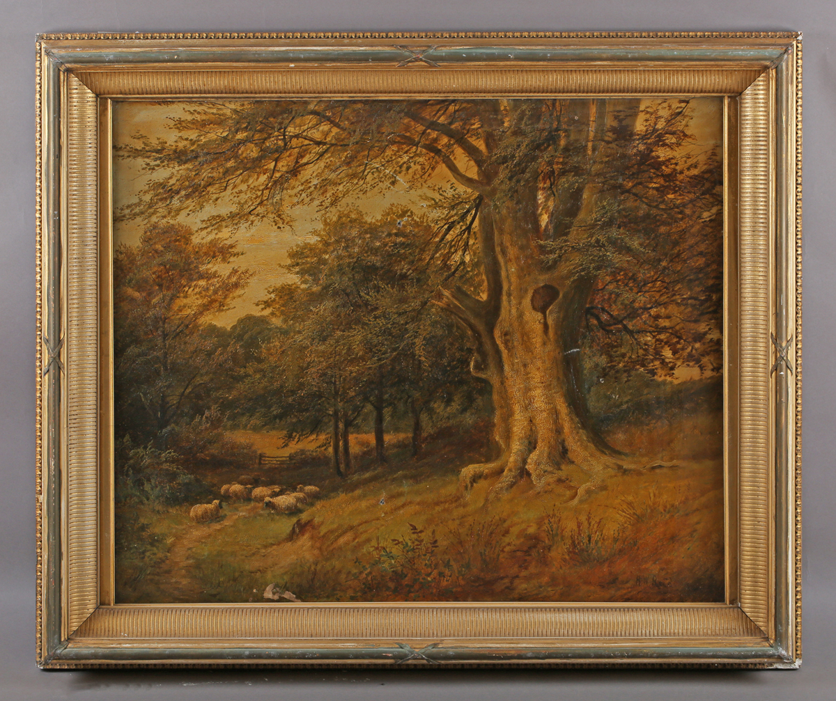 H.W. Reed (British late 19th/early 20th century) - Sheep resting in a wooded landscape, oil on canvas, signed lower right, 64cm x 76cm, within a gilt composition frame of deep section.