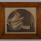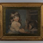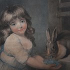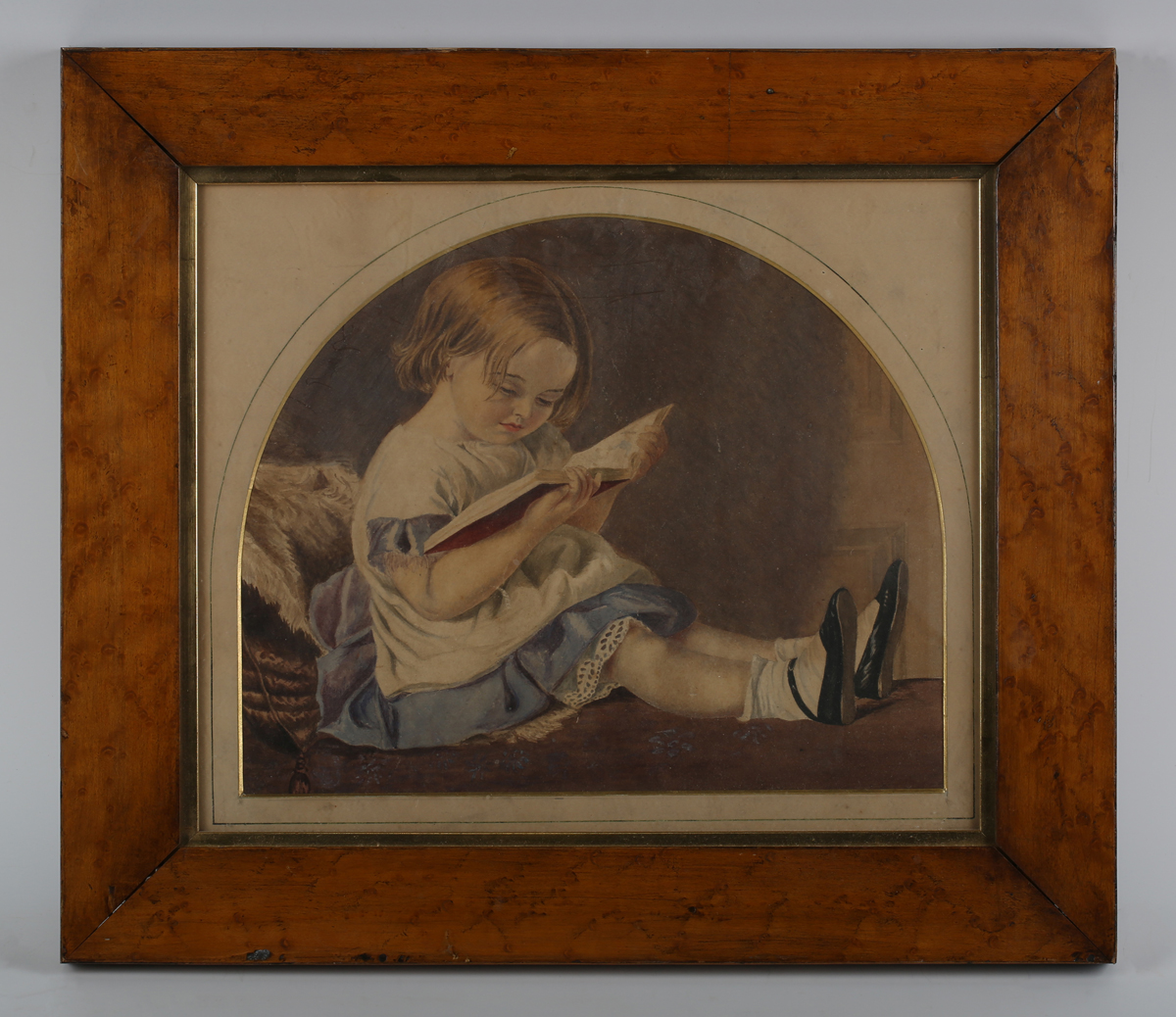 English School (19th century) - Study of a little girl reading, watercolour, arched top, 23cm x 28cm, within a bird's eye maple frame, together with a colour stipple engraving by Charles Knight after John Russell, 'The Favourite Rabbit’, 26cm x 34cm, within a gilt composition frame with beaded decoration (2).