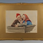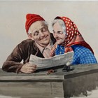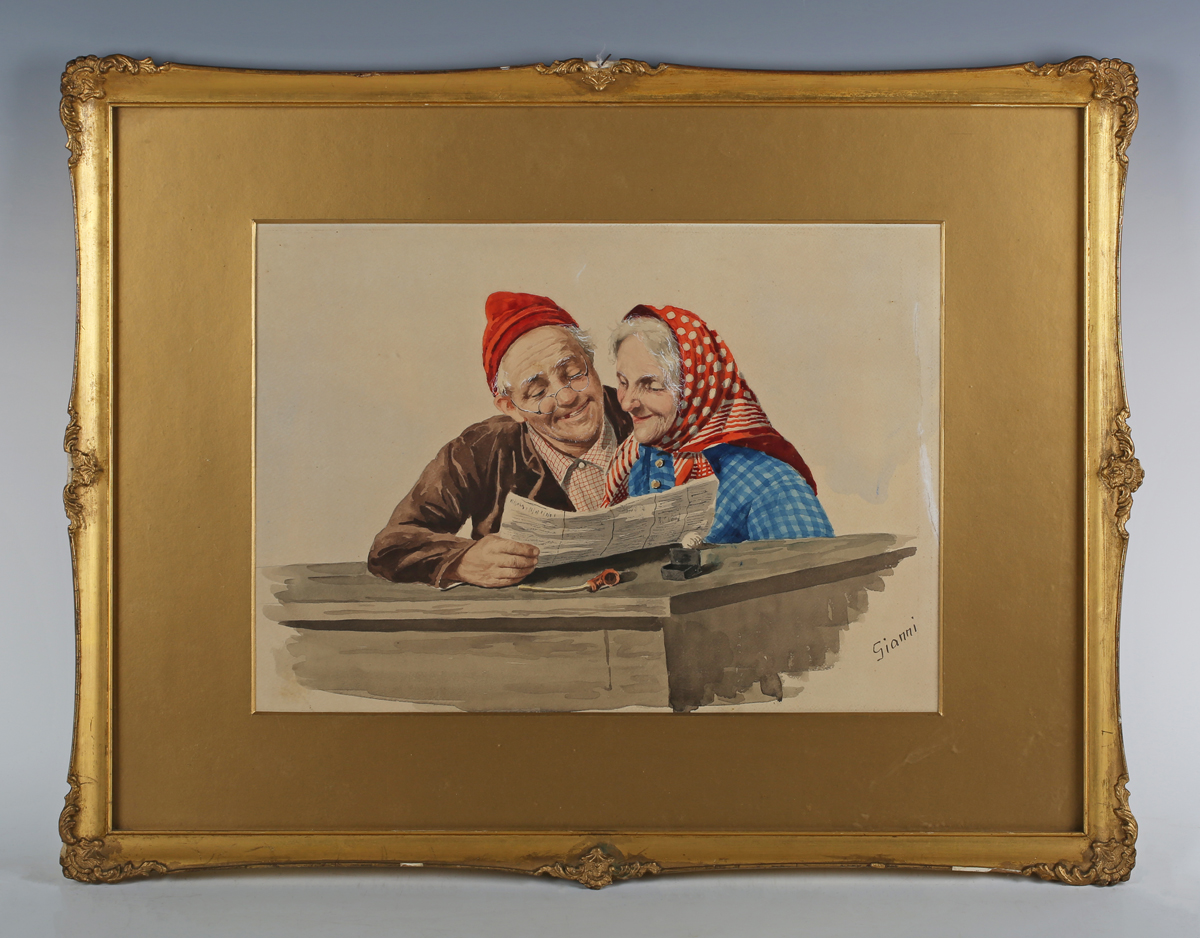 Gianni (Italian early 20th century) - Elderly couple reading the news, watercolour heightened with white, 30cm x 41.5cm, within a swept gilt composition frame.