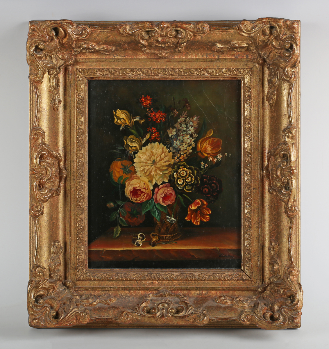 Eickelberg (20th century) - Floral still life, oil on panel, 23.5cm x 20cm, within a swept gilt composition frame.
