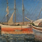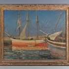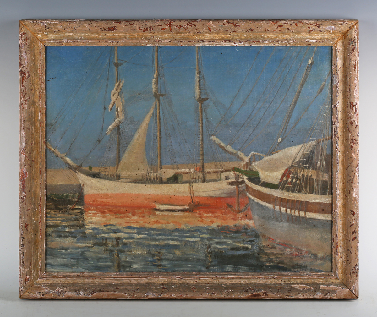 Jeanne Courtauld (British 1909-2009) - Palermo: two sailing boats at anchor, oil on canvas, signed lower right, inscribed verso, 40cm x 51.5cm, within a painted frame.