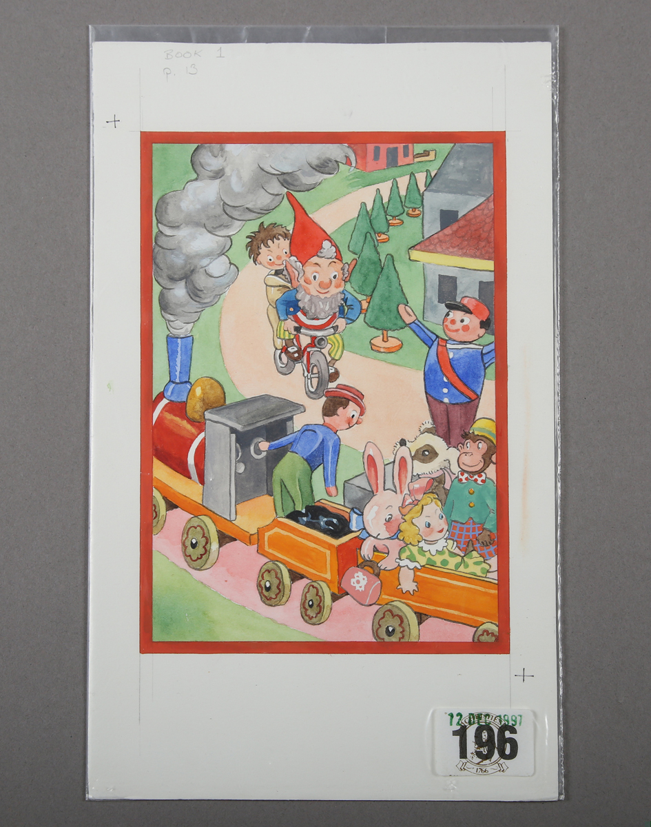 Mary Cooper (British 1911-?) - ‘They rode into the station at top speed’ from ‘Noddy goes to Toyland’, published 1949, watercolour and pencil, image 17.5cm x 12cm, unframed, together with a Christie's catalogue in which it was offered 12 December 1997, Lot 196.