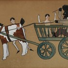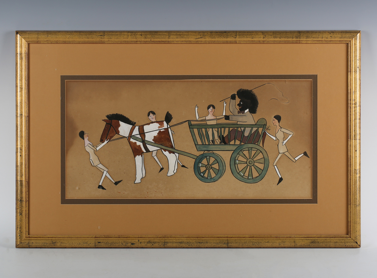 Florence Kate Upton (British 1873-1922) - Children’s illustration depicting wooden dolls and a golli driving a wooden horse and cart, watercolour and gouache, 24.5cm x 51.5cm, within a gilt frame.
